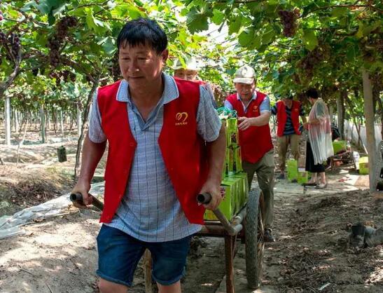 “來,又是一車了,大伙幫忙扶一把。”只見身著紅馬甲的志愿者們用手拉車一車接著一車地從余姚市河姆渡鎮(zhèn)蘆山寺村果農(nóng)孫惠明大伯的果園里裝運出260多箱葡萄,幫助孫大伯義摘義賣葡萄達2100斤,銷售金額近萬元。
