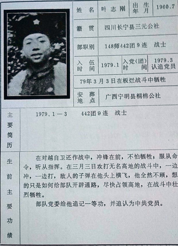 據(jù)了解,葉志剛烈士,四川省宜賓市長寧縣三元鄉(xiāng)人,1960年生,442團(tuán)9連戰(zhàn)士,1979年3月在自衛(wèi)還擊保衛(wèi)邊疆作戰(zhàn)中英勇犧牲,年僅19歲。戰(zhàn)后部隊(duì)黨委給他追記一等功,追認(rèn)為中國共產(chǎn)黨黨員。七九自衛(wèi)還擊保衛(wèi)邊疆作戰(zhàn)時(shí),張長順將軍時(shí)任原成都軍區(qū)司令部軍訓(xùn)部副部長,派駐148師工作組組長。戰(zhàn)后四十多年來,張將軍一直在牽掛著葉志剛烈士,一直在尋找烈士的親人,目的是為了兌現(xiàn)當(dāng)初面對烈士遺體作出的一個(gè)承諾!