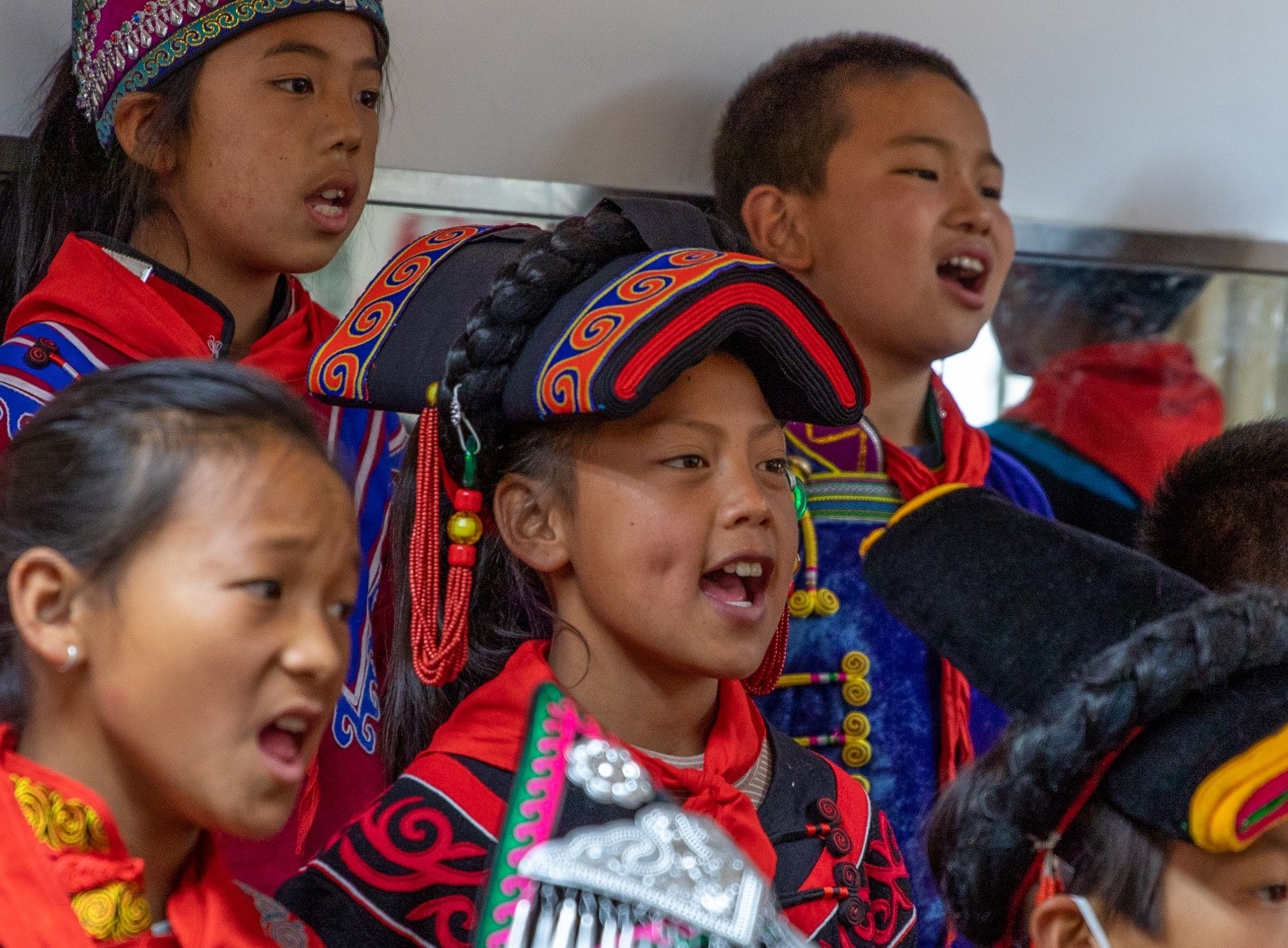 楊花校長是云寶舞蹈隊項目總負(fù)責(zé)人,云寶舞蹈隊可以說是在她的帶領(lǐng)下一路成長起來,她也有自己的藝術(shù)堅持:對于《彝紅》不斷進行創(chuàng)新、優(yōu)化,精益求精??梢钥隙ǖ氖牵麄儗τ谝妥逦幕膫鞒泻蛨猿钟肋h(yuǎn)不會變。離開操場,耳聞清亮的歌聲,循聲前行,原來是象寶合唱團正在訓(xùn)練中?;顒咏淌依?,隊員們跟著指導(dǎo)教師期沙高忠老師的指揮,用心練習(xí)彝族歌曲《索瑪花開》和《天空之城》,孩子們唱得既投入又享受。
