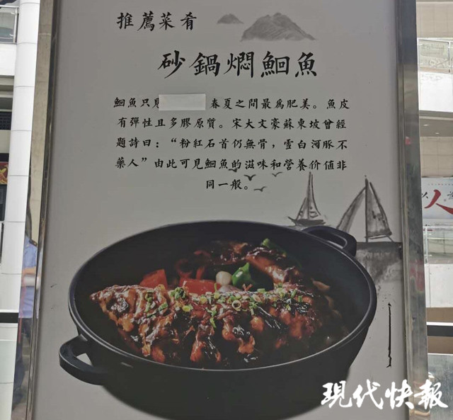 在秦淮區(qū)一家餐飲店,門口兩側(cè)矗立了多塊巨幅菜品廣告牌。雖然店家將廣告牌中出現(xiàn)的“江鮮”改成了“魚鮮”。但有的菜品宣傳文字仍有“長江”等字樣。比如,該餐飲店的一道推薦菜品“砂鍋燜鮰魚”,在廣告牌的推薦語中就這樣寫道:鮰魚只見于長江,春夏之間最為肥美……雖然未直接點(diǎn)名江鮮,但“鮰魚只見于長江”的說法,不免讓人產(chǎn)生聯(lián)想。對(duì)此,店家表示,這道菜原材料鮰魚為人工養(yǎng)殖,并未野生捕撈。