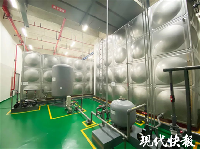江心洲還建設(shè)了不少海綿地塊,地塊里建設(shè)下凹式綠地、雨水收集系統(tǒng)、綠色屋頂、透水鋪裝等。江島科創(chuàng)中心屋頂上郁郁蔥蔥,綠化面積達(dá)1349平方米。雨水經(jīng)屋頂植被滲水、滯水、凈化后,通過排水管道統(tǒng)一收集于地下室的大型蓄水箱中。此外,江心洲的人行道采用透水鋪裝設(shè)計(jì),下雨時(shí),雨水可以通過路面滲流進(jìn)土壤,再匯入河道。