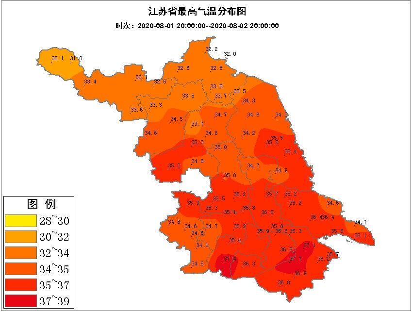 △8月2日江蘇最高氣溫 圖片來(lái)源:江蘇氣象
