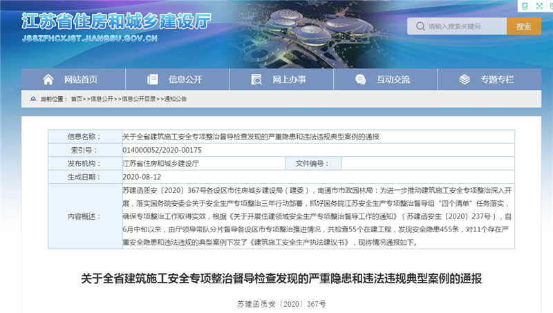 (記者 張瑜)近日,江蘇省住房和城鄉(xiāng)建設廳發(fā)布通報稱,自6月中旬以來,由省住建廳領導帶隊分片督導各設區(qū)市專項整治推進情況,共檢查55個在建工程,發(fā)現安全隱患455條,通報了11個存在嚴重安全隱患和違法違規(guī)的典型案例,并對這11個項目下發(fā)了《建筑施工安全生產執(zhí)法建議書》。