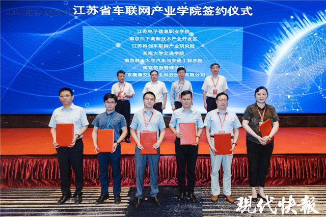 會上,由江蘇電子信息職業(yè)學(xué)院、江蘇科創(chuàng)車聯(lián)網(wǎng)產(chǎn)業(yè)研究院、南京白下高新產(chǎn)業(yè)技術(shù)開發(fā)區(qū)、東南大學(xué)交通學(xué)院、南京林業(yè)大學(xué)汽車與交通工程學(xué)院、南京信息管理學(xué)院、南京賽康交通安全科技股份有限公司共7家單位創(chuàng)建的“江蘇車聯(lián)網(wǎng)產(chǎn)業(yè)學(xué)院”正式簽約并揭牌。