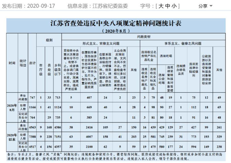 8月江蘇查處違反中央八項(xiàng)規(guī)定精神問題747起