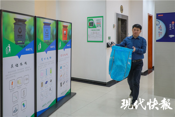 辦公室的工作人員袁立子正拎著收納袋,準(zhǔn)備去附近的垃圾分類收集點投放。“我們實行撤桶并點扔垃圾已經(jīng)有兩個月了,大家平時把廢紙張、塑料瓶這些可回收物都扔在這個袋子里,一般一周送到投放點一次。像是果皮、茶葉渣就扔在洗手間的垃圾桶里,保潔員會來回收。如果碰到加班吃個盒飯或是有電池等有害垃圾,就扔在大廳內(nèi)的收集點。”他坦言,開始時不太習(xí)慣,現(xiàn)在已經(jīng)很熟練了。