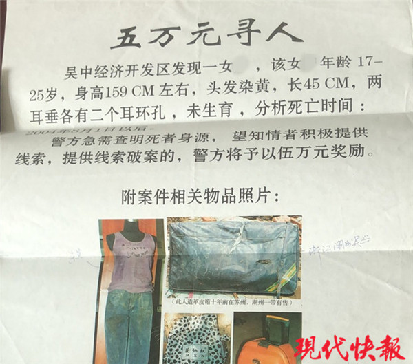 “為了確定受害人身份,有重合度的失蹤警情都溯源調查,近三個月的糾紛類警情都挨個回訪。每個參戰(zhàn)民警的筆記本、公文袋里都有一張啟事隨時對照,登報發(fā)啟事、做客新聞節(jié)目,能想到的方法也都用上了。”時任南區(qū)派出所刑偵副所長的張全弟回憶。