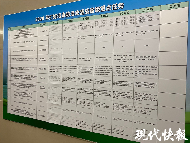 在南京新城大廈20樓,辦公室的走廊墻壁上貼了十塊展板,內(nèi)容是“2020年打好污染防治攻堅(jiān)戰(zhàn)省級(jí)重點(diǎn)任務(wù)”,一共100項(xiàng)任務(wù),按時(shí)間表分解,一目了然。以“降塵考核”為例,目標(biāo)是:降塵不得超過4.5噸/月.平方公里,責(zé)任單位是南京市生態(tài)環(huán)境局,每個(gè)時(shí)間節(jié)點(diǎn)都準(zhǔn)確標(biāo)注著任務(wù)的完成情況。截至2020年10月,南京的降塵量為3.34噸/月.平方公里……