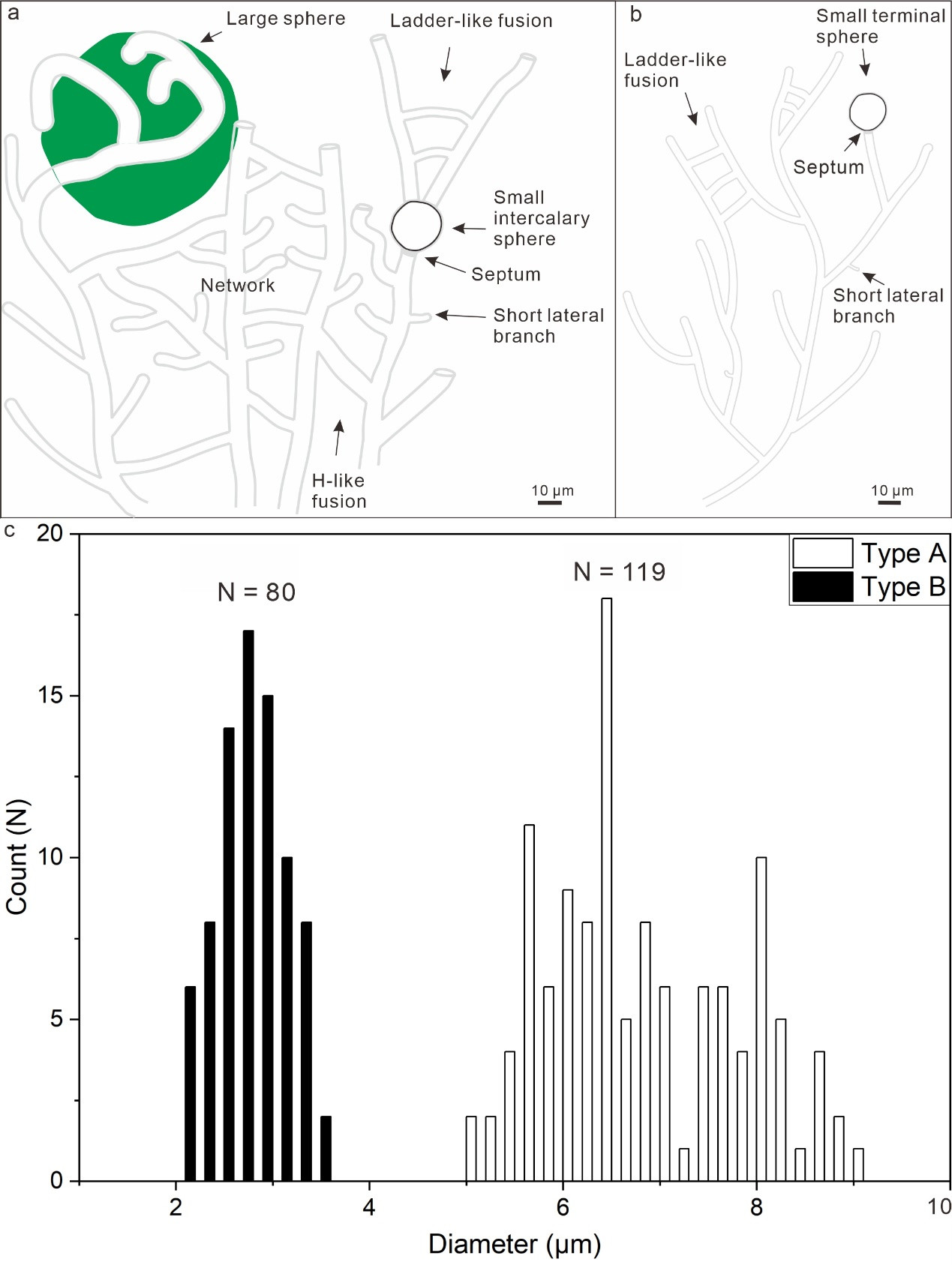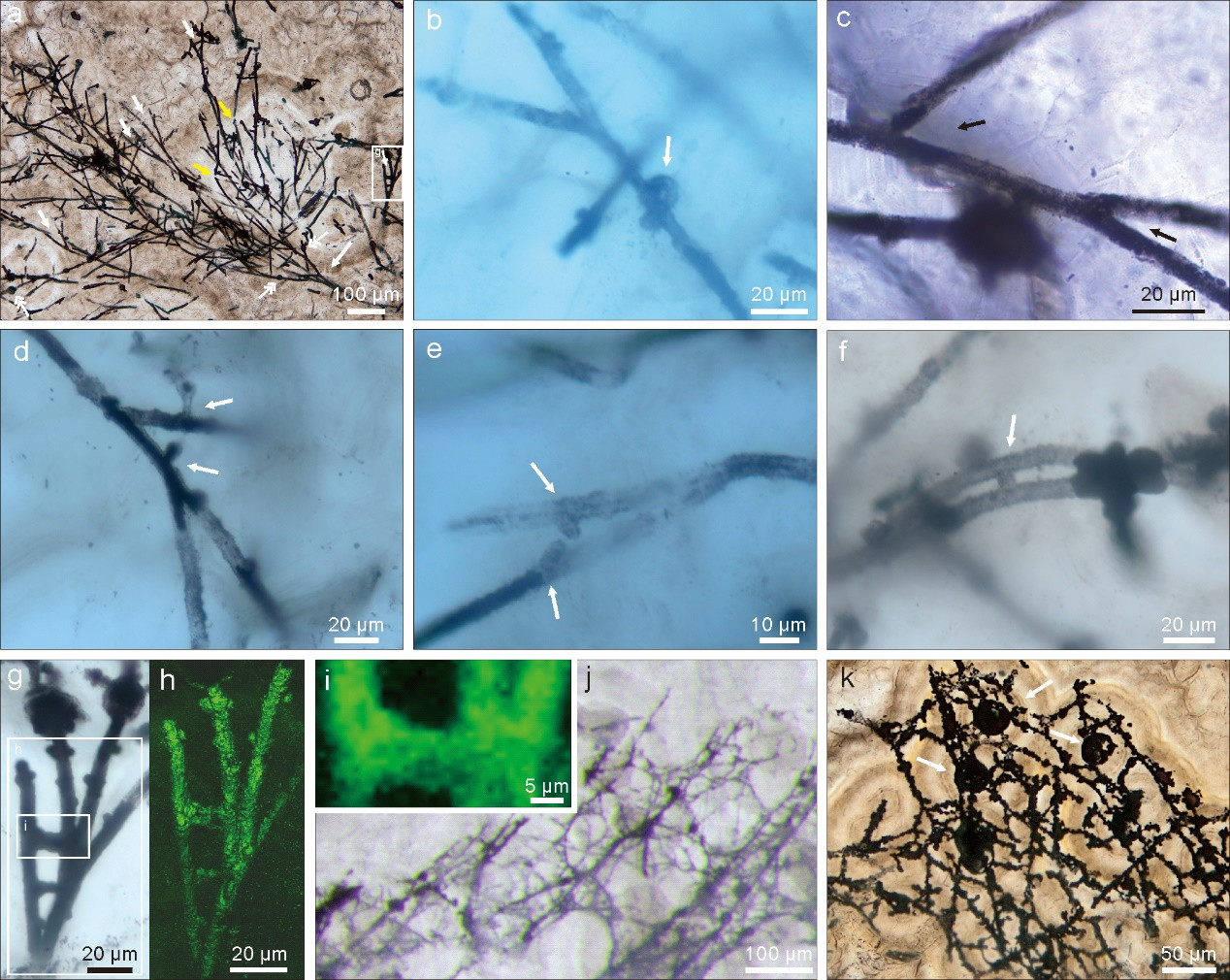 “我們發(fā)現(xiàn)6.3億年前的這種遠(yuǎn)古真菌類化石主要由兩部分構(gòu)成。一部分是長(zhǎng)度數(shù)百微米的空心細(xì)絲,另一部分是連接在細(xì)絲之間、直徑10至26微米的空心小球。”研究團(tuán)隊(duì)通過與現(xiàn)代類似真菌的比對(duì)推測(cè),細(xì)絲可能是真菌類生物的菌絲,而空心小球可能是用于繁殖的無性孢子。