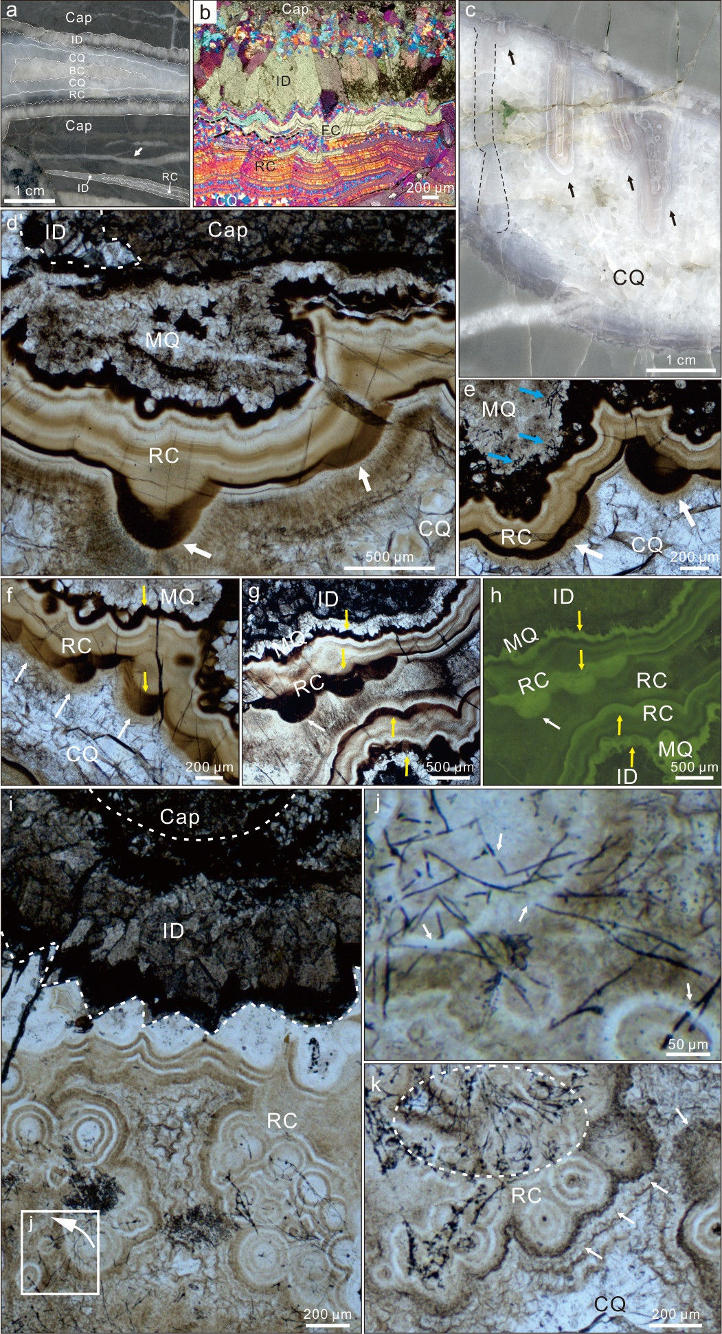 △席狀孔洞的巖石薄片顯微觀察,顯示不同期次的膠結(jié)物與真菌狀微體化石