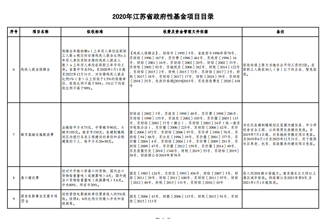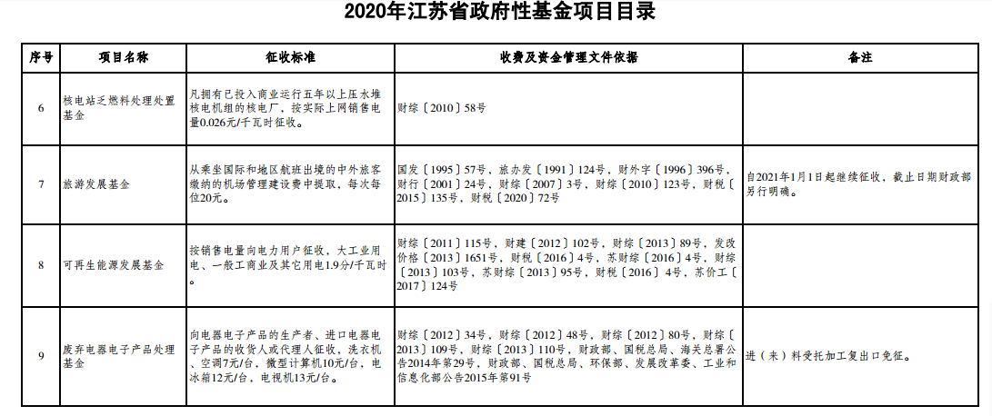 據(jù)悉,《基金目錄》中公布的18項政府性基金項目是截至2020年12月31日在江蘇省境內(nèi)征收的政府性基金項目,按照其收入歸屬關系分為兩類:一類是收入歸屬地方(或地方參與分成)的政府性基金項目(共9項)。具體包括森林植被恢復費、水利建設基金、文化事業(yè)建設費、教育費附加、地方教育附加、殘疾人就業(yè)保障金、城市基礎設施配套費、港口建設費、國家電影事業(yè)發(fā)展專項資金;另一類是收入歸屬中央的政府性基金項目(共9項),具體包括國家重大水利工程建設基金、中央水庫移民扶持基金、民航發(fā)展基金、船舶油污損害賠償基金、鐵路建設基金、核電站乏燃料處理處置基金、旅游發(fā)展基金、可再生能源發(fā)展基金、廢棄電器電子產(chǎn)品處理基金。