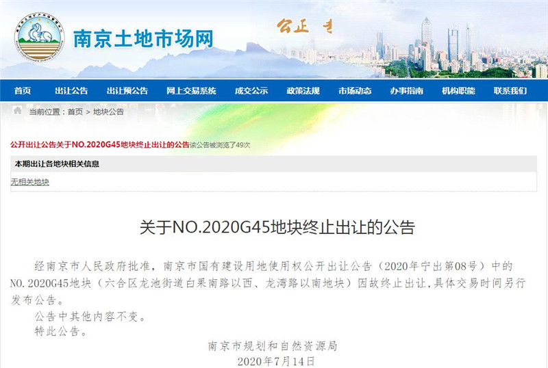 早在6月12日,南京掛出10幅涉宅地塊,要求按照“限房?jī)r(jià)、競(jìng)地價(jià)”的方式出讓。7月14日,南京市規(guī)劃和自然資源局發(fā)布公告稱,經(jīng)南京市人民政府批準(zhǔn),南京市國(guó)有建設(shè)用地使用權(quán)公開出讓公告(2020年寧出第08號(hào))中的NO.2020G45地塊(六合區(qū)龍池街道白果南路以西、龍灣路以南地塊)因故終止出讓,具體交易時(shí)間另行發(fā)布公告。