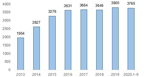 圖表:2013-2020年寫(xiě)字樓存量情況(萬(wàn)㎡)