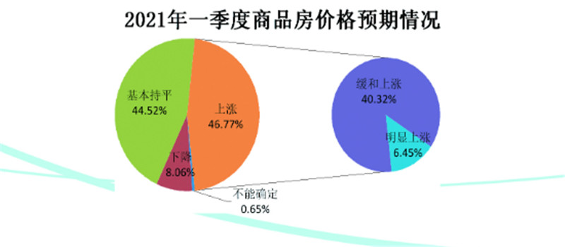 在房地產(chǎn)調(diào)控基調(diào)不變的大背景下,房?jī)r(jià)剛性上漲預(yù)期正逐步被打破。調(diào)查顯示,一季度,預(yù)計(jì)商品房總體價(jià)格上漲的145人,占比46.77%;預(yù)計(jì)總體價(jià)格基本持平的138人,占比44.52%;預(yù)計(jì)總體價(jià)格下降25人,占比8.07%;還有0.65%的人不確定??傮w來看,一季度商品房總體價(jià)呈穩(wěn)中緩漲預(yù)期。相對(duì)于2020年四季度的調(diào)查,本期商品房總體價(jià)格看漲預(yù)期有所降溫,由緩漲預(yù)期轉(zhuǎn)為穩(wěn)中緩漲預(yù)期。