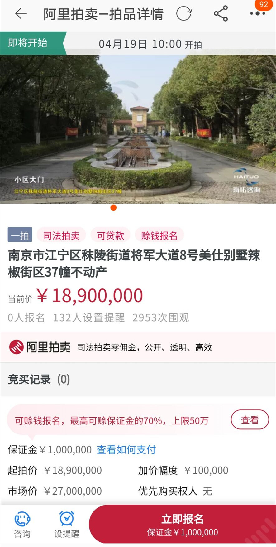 據(jù)了解,南京市秦淮區(qū)人民法院將于2021年4月19日上午10點(diǎn)到2021年4月20日上午10點(diǎn)在阿里拍賣平臺(tái)進(jìn)行公開(kāi)拍賣,起拍價(jià)為1890萬(wàn)元,保證金為100萬(wàn)元,加價(jià)幅度為10萬(wàn)元。