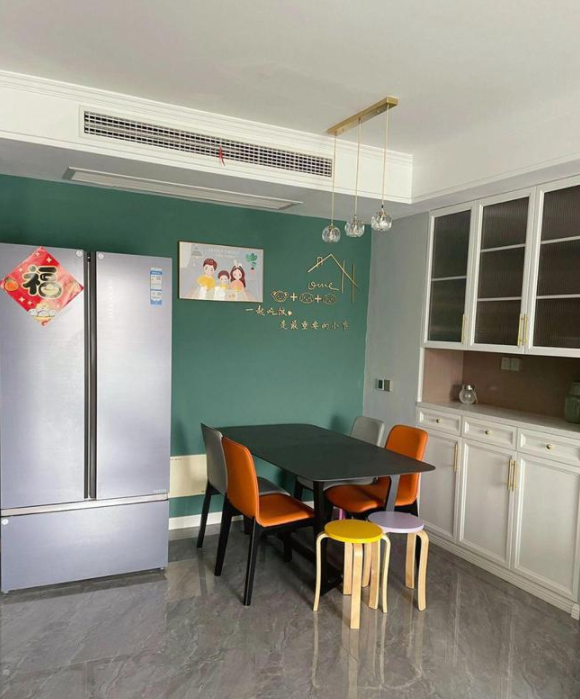 餐廳背景墻選擇了深綠色的設計,為整個家居環(huán)境增添一抹綠色,青春有活力,視覺上也會起到放松的體驗,黑色巖板餐桌,搭配各種顏色的餐椅和餐凳,打造多姿多彩的生活氛圍。餐邊柜嵌入式設計,擁有多種收納空間,長虹玻璃柜門作為酒柜剛剛好,若隱若現(xiàn)的效果,給人一種好奇感和神秘感。