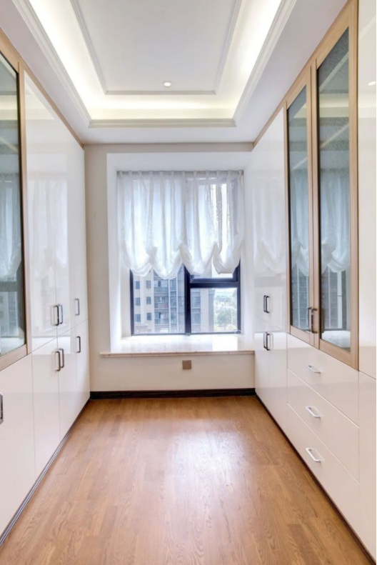 在沒有飄窗的戶型中,如果窗戶旁邊的空間又是比較寬裕的,就可以在靠窗位置裝上一排的飄窗,然后把飄窗兩側(cè)的空間也做成收納柜利用起來。這樣靠窗也能安裝定制柜,還不會讓柜子遮擋窗戶、影響空間的采光與通風(fēng)。