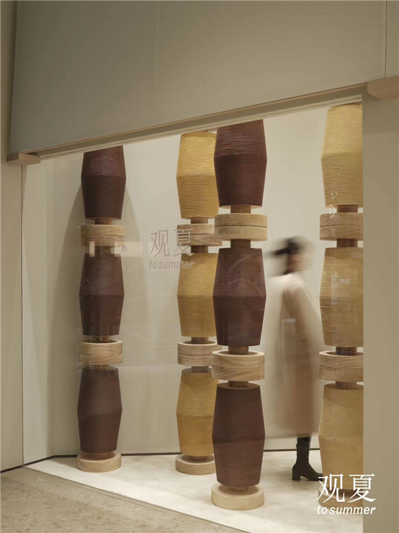 觀夏云坊的空間設計靈感來源于匠人創(chuàng)作云錦的過程,用空間之美講述一絲一線編織而成的故事。云錦織布機體型高大,需要一對云錦匠人同時親密合作才能運轉,織布機上的絲線和織物要經(jīng)過很多雙手的反復觸摸,最終才能成為一件在古代只有皇室才能使用的藝術品。觀夏云坊外立面裝飾的木棍和棉線,意在模擬織布機的結構。云錦織布機的構造很特殊,工匠們在編織時只能看到云錦背面的經(jīng)緯走勢,也就是“織造”的過程。
