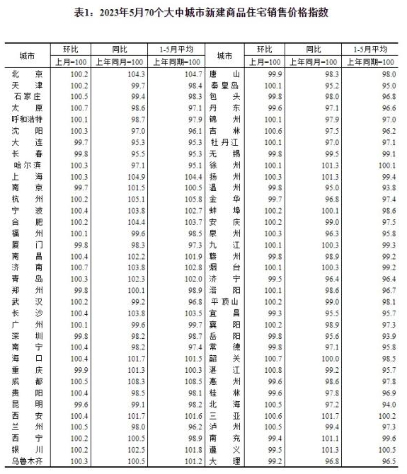 2023年5月70個(gè)大中城市新建商品住宅銷售價(jià)格指數(shù)。 截圖自國(guó)家統(tǒng)計(jì)局官網(wǎng)