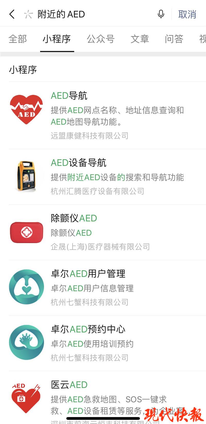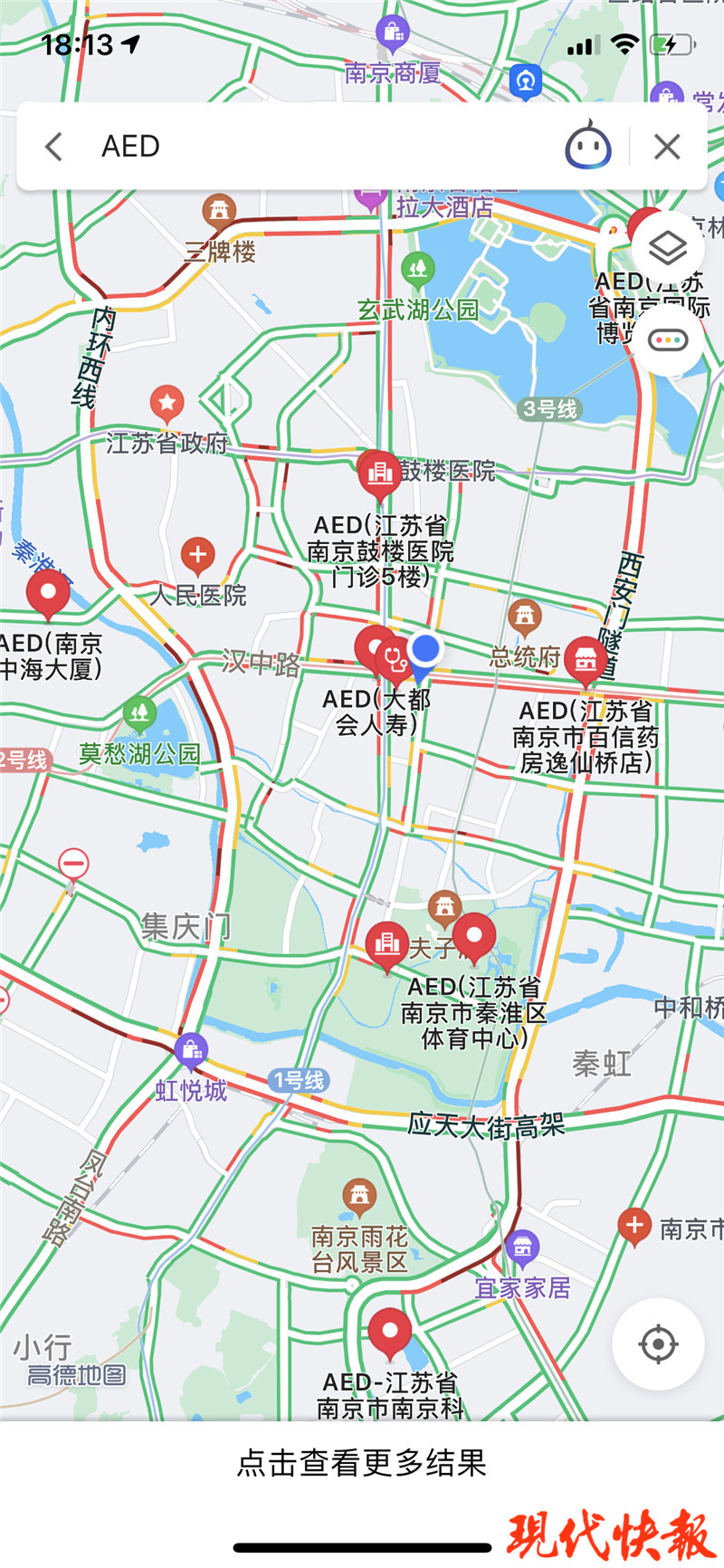 據(jù)了解,2019年4月,江蘇省衛(wèi)健委公布了“AED分布地圖”,公眾一旦有需要,可直接在騰訊、百度地圖等搜索“AED”,或者在微信、QQ的“城市服務(wù)”里快速查找附近設(shè)置的AED。現(xiàn)代快報(bào)記者在長(zhǎng)江路附近,打開(kāi)手機(jī)里一款導(dǎo)航APP,在搜索框里輸入“AED”,立刻搜索出10多個(gè)AED位置,最近的相距519米,最遠(yuǎn)的相距14.4公里。