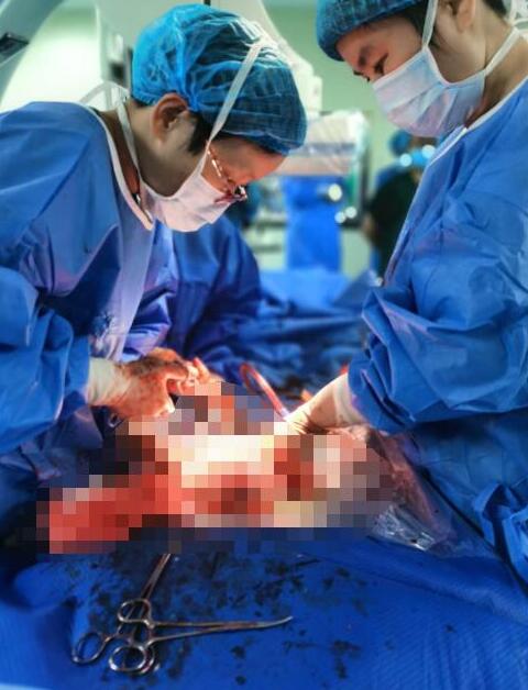 手術(shù)當(dāng)天,相關(guān)科室各司其職,麻醉科的手術(shù)器具、輸血科的血液制品等均準(zhǔn)備妥當(dāng)。當(dāng)日上午DSA導(dǎo)管室內(nèi),劉祥副主任的髂總動(dòng)脈球囊順利放置,隨后麻醉科陳緒軍主任對(duì)患者進(jìn)行了全身麻醉;11:05分,剖宮產(chǎn)手術(shù)開始,產(chǎn)科李春霞主任親自操刀,僅三分鐘就將胎兒取出,胎兒反應(yīng)良好??烧嬲目简?yàn)還在后面:因胎盤完全覆蓋宮頸內(nèi)口,并且有部分植入,剝離胎盤時(shí)其附著處子宮肌壁菲薄如紙,剝離困難,且子宮收縮差,出血量非常多。事不宜遲,該“球囊”出馬了,依李春霞主任的要求,劉祥副主任立即進(jìn)行髂總動(dòng)脈球囊臨時(shí)阻斷子宮血流,術(shù)野出血立刻減少了許多,同時(shí),麻醉團(tuán)隊(duì)密切監(jiān)測(cè)著患者的生命體征,根據(jù)醫(yī)囑及時(shí)輸血補(bǔ)液。在麻醉科、輸血科的穩(wěn)妥支持及劉祥副主任的“球囊阻斷”良好止血的配合下,手術(shù)臺(tái)上的產(chǎn)科醫(yī)師抓緊時(shí)間進(jìn)行植入胎盤的處理及創(chuàng)面的縫扎止血,在最短的時(shí)間內(nèi)完成了人工剝離胎盤、子宮動(dòng)脈上行支結(jié)扎術(shù)、宮腔紗條填塞,術(shù)中患者生命體征平穩(wěn),手術(shù)也最終順利結(jié)束。