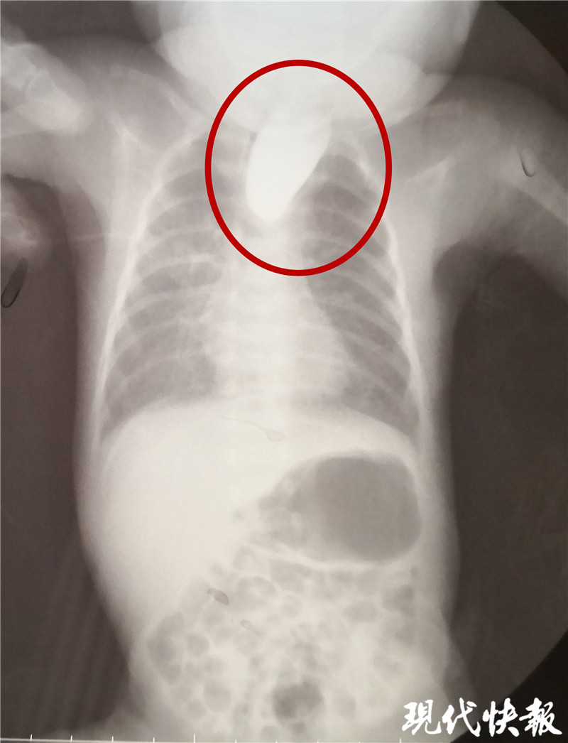 現(xiàn)代快報(bào)記者了解到,9月8日,東東從當(dāng)?shù)蒯t(yī)院轉(zhuǎn)入淮安市婦幼保健院治療,檢查顯示東東的食道是個“死胡同”,明確診斷為食道閉鎖。“從片子上看,這個白色的造影劑到了食管上端就無法向下流了,說明孩子的食管上端是不通的、閉塞的。同時,孩子腸腔里面有氣體,這個氣體是通過氣道到食管的遠(yuǎn)端,到達(dá)胃和腸道內(nèi)。”淮安市婦幼保健院小兒外科副主任醫(yī)師夏順林說,這個寶寶如果不及時手術(shù),就會面臨兩個問題,一個就是唾液咽不下去,會嗆入肺部形成吸入性肺炎,同時胃和食管遠(yuǎn)端與氣管相通,胃內(nèi)的胃酸容易反流到氣道里面,進(jìn)入肺部形成化學(xué)性肺炎。