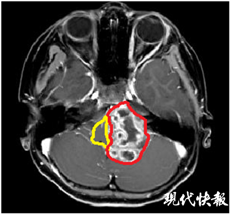 △術(shù)前核磁共振:黃色標(biāo)記為腦干,紅色標(biāo)記為腫瘤