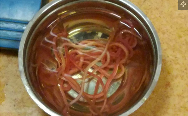 無獨(dú)有偶,2018年印度一名38歲的女子的膽管里也長了蛔蟲。她在經(jīng)歷了六個(gè)月的嚴(yán)重腹痛、發(fā)燒、嘔吐和黃疸(皮膚和眼睛發(fā)黃)后前往醫(yī)院。CT檢查發(fā)現(xiàn),她的膽管里一共有14只蛔蟲在蠕動(dòng)。醫(yī)生通過內(nèi)窺鏡一條一條把它們揪出來扔在盆里,每條約有15至20厘米……