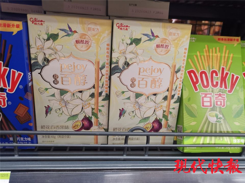 在南京一家知名大型超市里,貨架上擺放著各種各樣的零食。其中有一款名為“百醇”的注心餅干,推出了新的配方產(chǎn)品,被擺放在顯眼的位置上。只見(jiàn)包裝盒上用彩色字體標(biāo)注有“新配方煙酰胺”的字樣,旁邊還有一行小字:“煙酸有助于維持皮膚和黏膜健康”。在背面成分表的最后一項(xiàng),標(biāo)注有“煙酸(煙酰胺)”,每盒含量為0.6毫克。