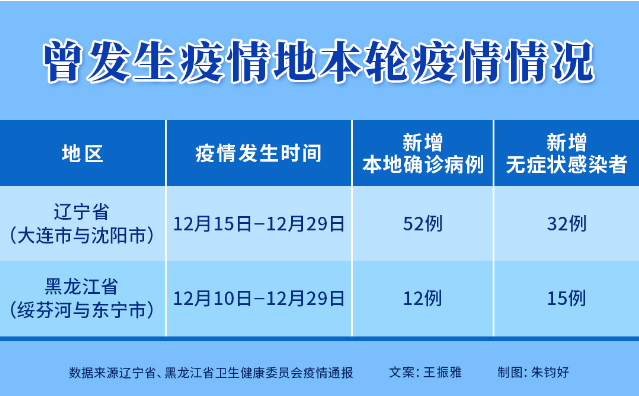 12月10日,黑龍江省綏芬河市和東寧市各新增確診病例1例,黑龍江省疫情出現(xiàn)。截至12月29日,19天內(nèi),黑龍江省新增確診病例12例,新增無癥狀感染者15例。綏芬河上一波疫情為3月27日境外屬于疫情。5月6日,綏芬河防疫風險等級下調(diào)為低風險。