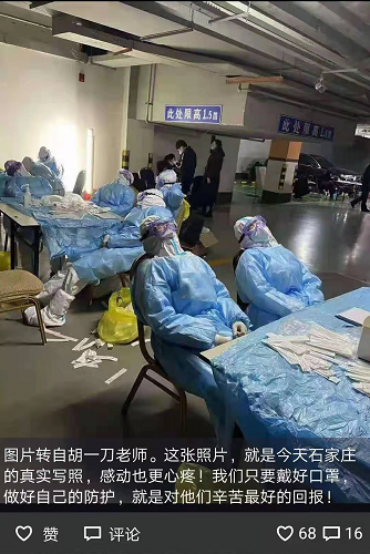 這兩日,這張照片在石家莊朋友圈刷屏。1月6日凌晨3點(diǎn)醫(yī)護(hù)人員進(jìn)入石家莊市裕華區(qū)槐底社區(qū)當(dāng)時,室外溫度達(dá)到了零下12度,地下車庫滴水成冰,累到不行的時候他們才稍微靠著歇一歇。