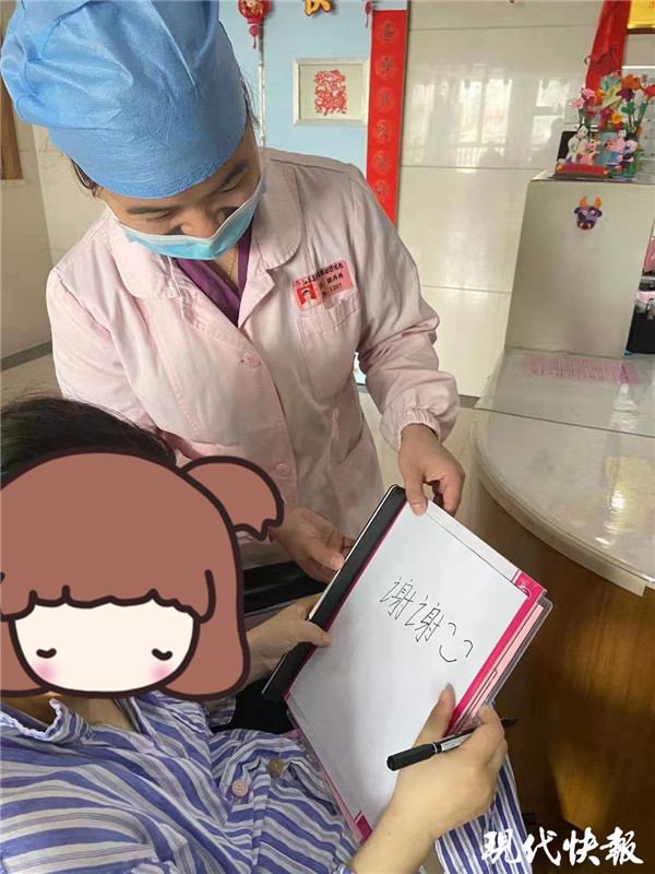 用眼神和紙筆進行特殊又溫暖的“對話”,給了胡女士很大的信心,順利誕下一名女寶寶。“分娩完非常激動,她自己不會寫字,為了表達自己的謝意,所以她就照著手機寫了謝謝兩個字來感謝我們,還畫了一個笑臉,這個新年禮物讓我倍感溫暖,雖然是無聲的,但也讓我有了滿滿的職業(yè)自豪。”邵丹丹說。
