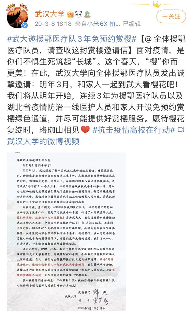 今年3月初,早櫻綻放,湖北向全國人民發(fā)出賞櫻邀約,武漢大學也表示,將在3月13日、14日開設抗疫醫(yī)護賞櫻專場。