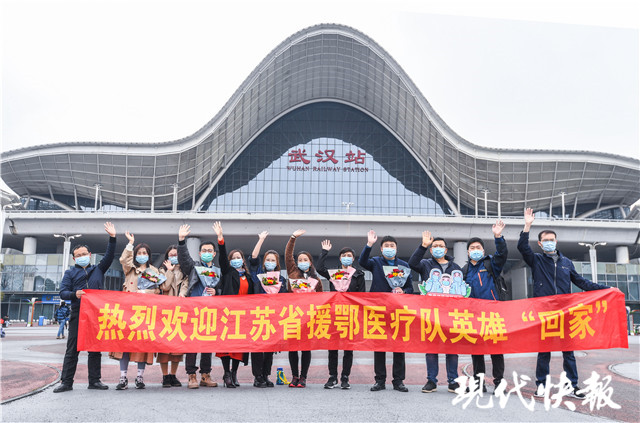 “熱烈歡迎江蘇省援鄂醫(yī)療隊英雄‘回家’!”中午,武漢市江夏區(qū)第一人民醫(yī)院的醫(yī)護人員早早地守在武漢站站臺??吹皆?jīng)并肩作戰(zhàn)53天的戰(zhàn)友高燕,江夏區(qū)第一人民醫(yī)院感染科護士長倪寶紅再也控制不住,第一時間與戰(zhàn)友緊緊相擁。