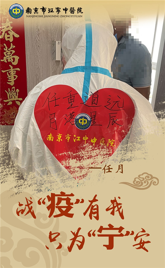看不見防護(hù)服里流滿汗水的你;看不清面屏下憔悴面容的你;看不透明明很辛苦卻要堅持到底的你,唯一能看清的是防護(hù)服上藏有你名字的戰(zhàn)“疫”標(biāo)語和有著醫(yī)院名稱的紅色愛心。初心使然,唯有前行;使命在肩,唯有奮進(jìn)!你們團(tuán)結(jié)一心,匯聚起戰(zhàn)勝病毒的磅礴力量,你們有著一個共同的名字“江寧中醫(yī)人”!