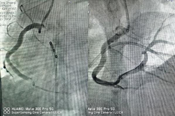 醫(yī)生立即予以搶救,并第一時(shí)間通知心內(nèi)科值班醫(yī)師,緊急啟動(dòng)綠色通道,全院相關(guān)科室全力配合,心內(nèi)科介入團(tuán)隊(duì)分工明確,迅速啟動(dòng)導(dǎo)管室。因患者心梗后并發(fā)嚴(yán)重心律失常,為了安全起見,造影前植入臨時(shí)起搏器,造影提示右冠狀動(dòng)脈急性完全閉塞,并成功開通血管,患者胸痛即刻緩解,目前正在康復(fù)過程中。
