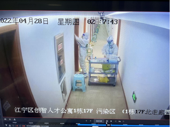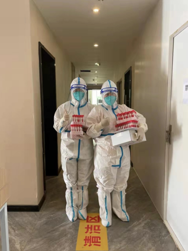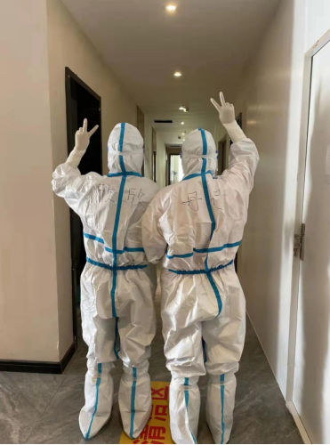 由于創(chuàng)智人才公寓隔離點接收的上海外轉(zhuǎn)人員眾多,有時一天下來就要接收300多人,工作強度很大,劉欣和徐世丹常常累得腿都抬不起來。每天一大早,從房間配置、人員配備、醫(yī)廢、人員轉(zhuǎn)運,再到消殺、垃圾閉環(huán)處置等,劉欣和徐世丹沒有停下過忙碌的腳步。她們?nèi)諒鸵蝗瞻戳鞒坦ぷ?,不放過任何一個細節(jié)。同時時刻和群里的隔離人員溝通,保障他們的正常生活。一天,徐世丹剛剛采集完核酸回到房間,忽然聽見手機在響,接聽后了解到一位母親正急匆匆地給11歲的女兒尋找生理用品,她迅速穿好防護服將所需物品親自送到母親手中,“謝謝你,太感謝了!”徐世丹卻表示,“您的感謝,才是我們工作的動力。”在到達創(chuàng)智人才公寓之前,徐世丹已經(jīng)在其他隔離點工作一個多月了,上一段工作結(jié)束之后,她緊接著又來到這里,繼續(xù)她的抗“疫”之路。