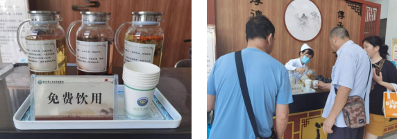 一杯中醫(yī)降暑茶飲:夏季氣候濕熱,醫(yī)院根據(jù)氣候特點(diǎn),充分發(fā)揮中醫(yī)藥特色,每天在門診大廳,免費(fèi)為患者提供中藥消暑茶飲、祛濕茶飲。