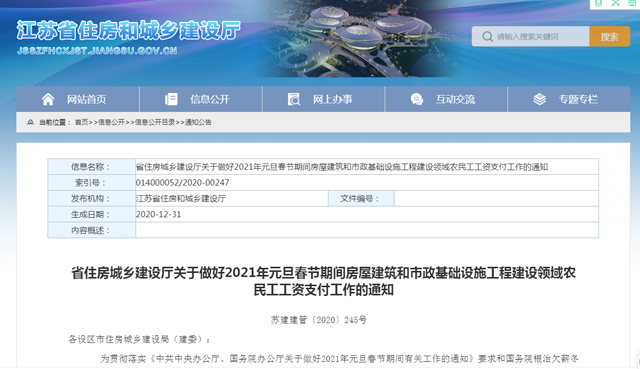 (實(shí)習(xí)生 黃鈺曄 記者 張瑜)近日,江蘇省住房和城鄉(xiāng)建設(shè)廳發(fā)布《關(guān)于做好2021年元旦春節(jié)期間房屋建筑和市政基礎(chǔ)設(shè)施工程建設(shè)領(lǐng)域農(nóng)民工工資支付工作的通知》(以下簡(jiǎn)稱《通知》),要求各地切實(shí)做好元旦春節(jié)期間農(nóng)民工工資支付工作,保障農(nóng)民工合法權(quán)益?!锻ㄖ访鞔_,加大拖欠工程款和工資查處力度,對(duì)不主動(dòng)落實(shí)、不積極配合有關(guān)部門解決拖欠農(nóng)民工工資問題,引發(fā)群體性事件并造成嚴(yán)重后果的有關(guān)單位和責(zé)任人,要進(jìn)行約談、通報(bào)和問責(zé)。
