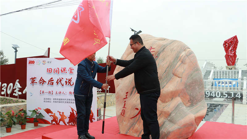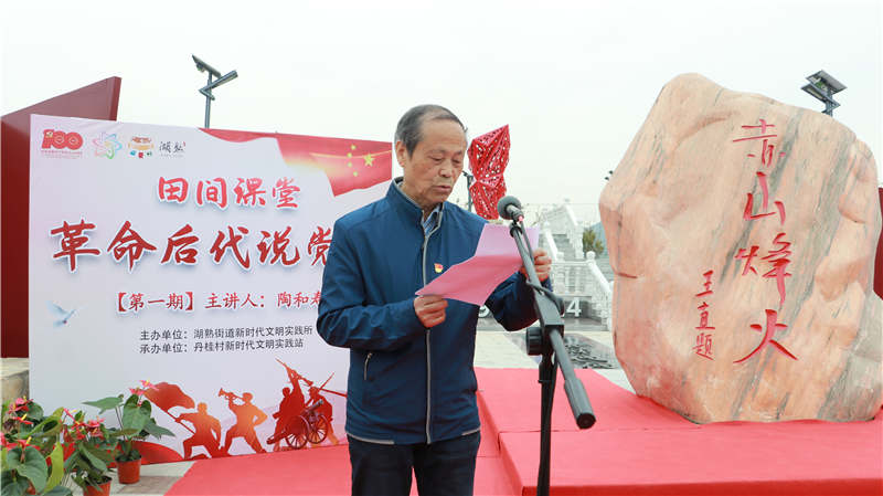 為慶祝中國共產(chǎn)黨成立100周年,4月7日,南京市江寧區(qū)湖熟街道新時代文明實踐所聯(lián)合丹桂村新時代文明實踐站在赤山烽火廣場開展了田間課堂之“革命后代說黨史”活動,特別邀請到革命先烈陶家齊之子陶和壽先生來到現(xiàn)場,以面對面、心連心的方式讓湖熟青年繼承革命傳統(tǒng)、傳承紅色基因、傳遞革命薪火,進一步加強對黨史的認識,厚植愛國愛黨情懷。