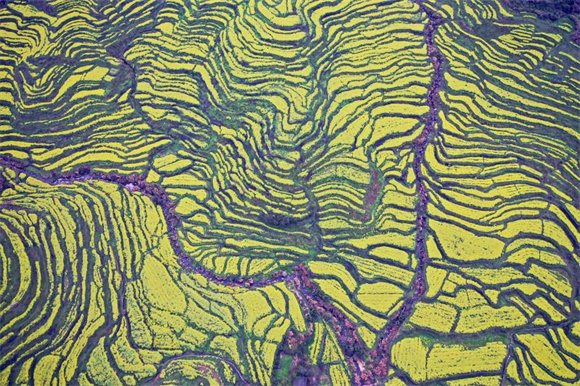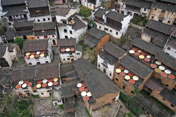 白墻黛瓦民居的屋頂搭起了曬架,圓圓曬匾里五彩繽紛豐收果實的組合,繪就出世界獨一無二的"曬秋"農(nóng)俗景觀,加上梯田油菜花,高度飽和豐富斑讕的色彩,是江西省婺源縣江灣鎮(zhèn)篁嶺景區(qū)最美的調(diào)色板,來這里您就可以享受一場視覺盛宴。
