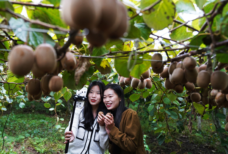 10月27日,在奉新縣赤岸鎮(zhèn)城下村,直播團(tuán)隊(duì)在果園里通過(guò)直播幫助果農(nóng)銷(xiāo)售獼猴桃。新華社記者 萬(wàn)象 攝