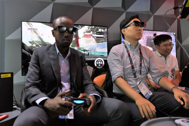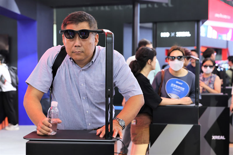 6月28日,人們?cè)赬REAL展臺(tái)佩戴AR眼鏡試玩游戲。
