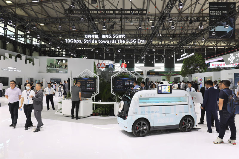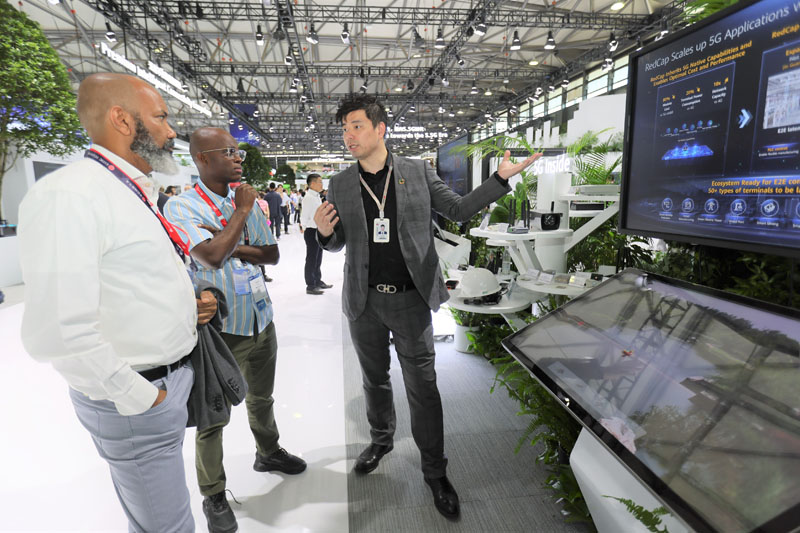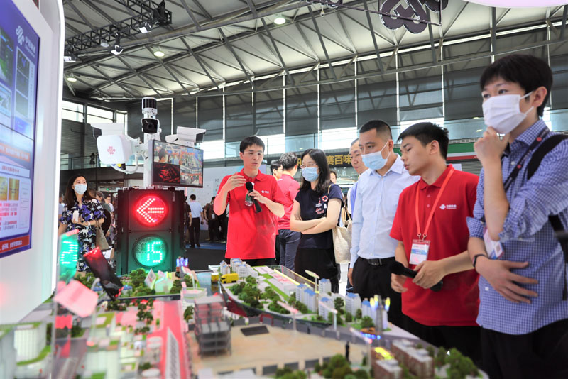 6月28日,工作人員在中國(guó)聯(lián)通展臺(tái)為參觀者介紹5G通信感知智能系統(tǒng)。