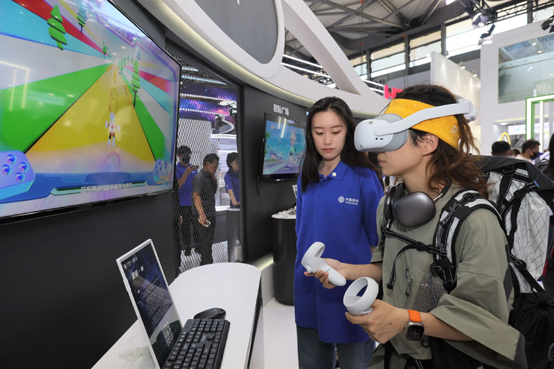 6月28日,人們?cè)谥袊?guó)移動(dòng)展臺(tái)佩戴VR智能眼鏡進(jìn)行體驗(yàn)。