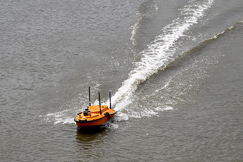 8月2日,一艘無人水文監(jiān)測船在天津獨流減河進洪閘上游航行監(jiān)測。 新華社記者 孫凡越 攝