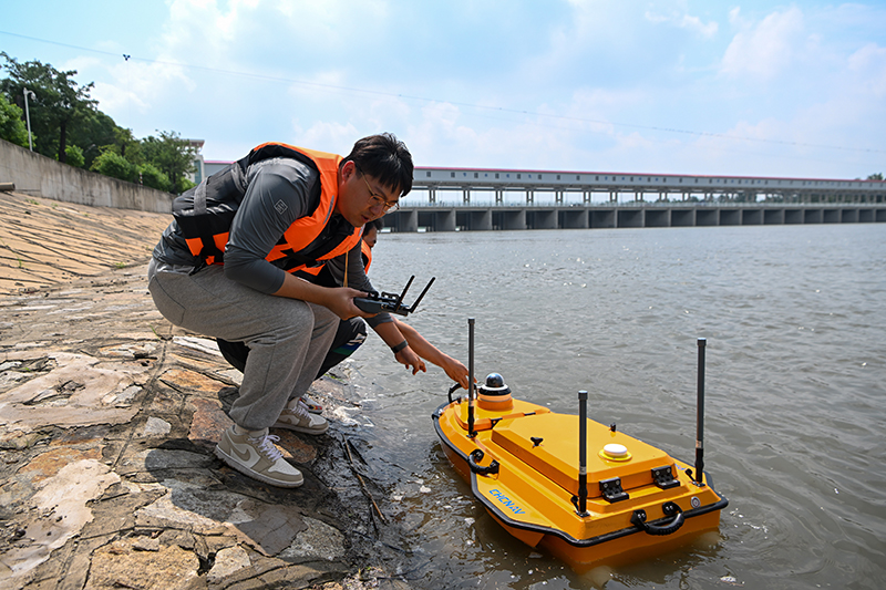 8月2日,在天津市獨流減河進洪閘上游,水文人員操作無人水文監(jiān)測船進行水文監(jiān)測。新華社記者 孫凡越 攝
