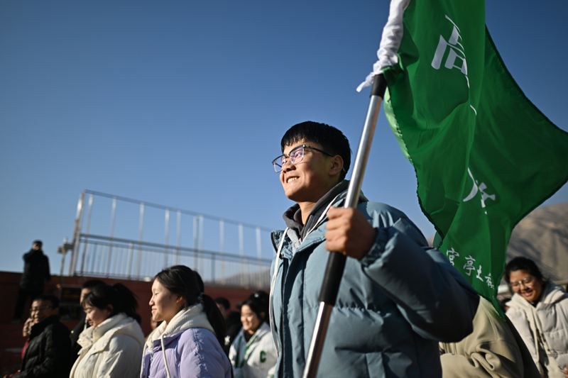 12月25日,來自民和縣官亭鎮(zhèn)土族中學(xué)的學(xué)生馬忠林(前右)和同學(xué)們在民和縣城西高級中學(xué)的操場上跑操。新華社記者 張宏祥 攝
