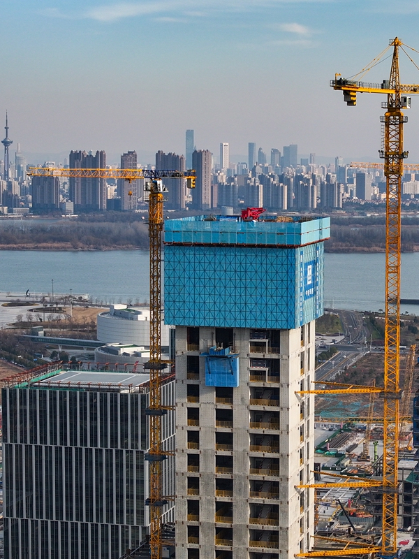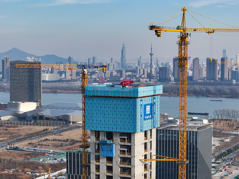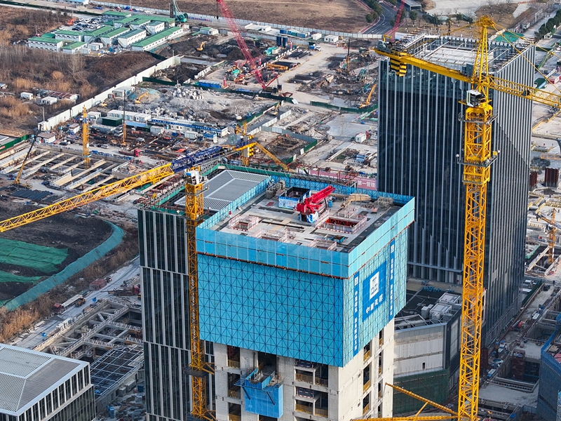 當日,在江蘇省南京市江北新金融中心一期項目施工現(xiàn)場,承建方中建三局運用“空中造樓機”進行項目封頂前的最后一次頂升作業(yè),各項施工穩(wěn)步推進。據(jù)介紹,該項目建造采用智能集成“空中造樓機”,提高了高層建筑施工的機械化、智能化及綠色施工水平,讓“高空作業(yè)”變?yōu)椤笆覂仁┕ぁ?,施工效能提升約20%。