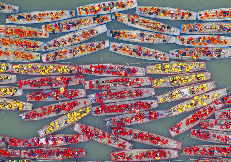 4月6日拍攝的溱潼會船現(xiàn)場(無人機照片)。新華社發(fā)(顧繼紅?攝)